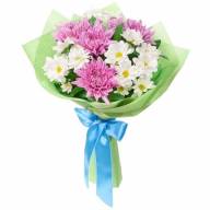 Нежный букет «Закат» выполнен в розовых и белых тонах, которые отлично гармонируют друг с другом. Здесь кустовые хризантемы смешались с одноголовыми и вместе смотрятся великолепно. Цветы выражают нежность и заботу, чистоту намерений. Они универсальны и подарить можно любимой, другу, коллеге, даже ребенку. Выбрав такой букет, не ошибетесь и подарите положительные эмоции.